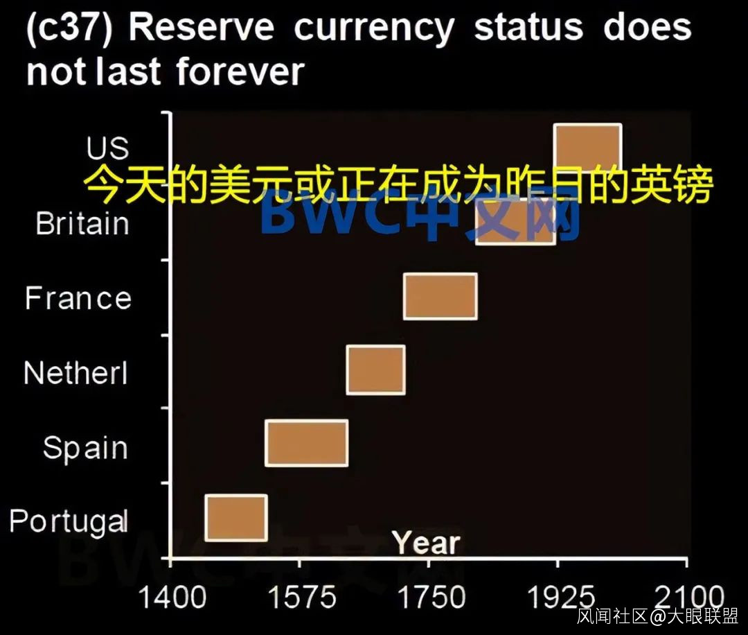羅傑斯認為,現在美元儲備地位的傳統改變了。正如下圖所示,英鎊和荷蘭盾的命運,在過去的幾個世紀中,它們曾被認為是最可靠的貨幣,但之後都被替代了。