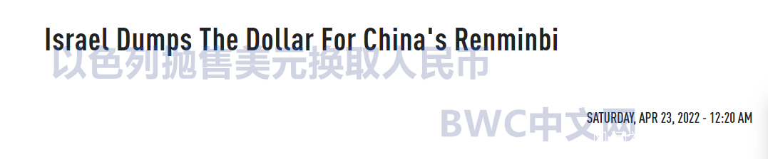 特別是,美國金融網站Zeroehedge稱,以色列拋售美元換取人民幣,早在4月時就已經正式宣佈用人民幣替代部分美元儲備份額。在以色列外匯儲備佈局中,2022年人民幣的比重定為2%。而美元的份額將從 66.5% 下降到 61%。