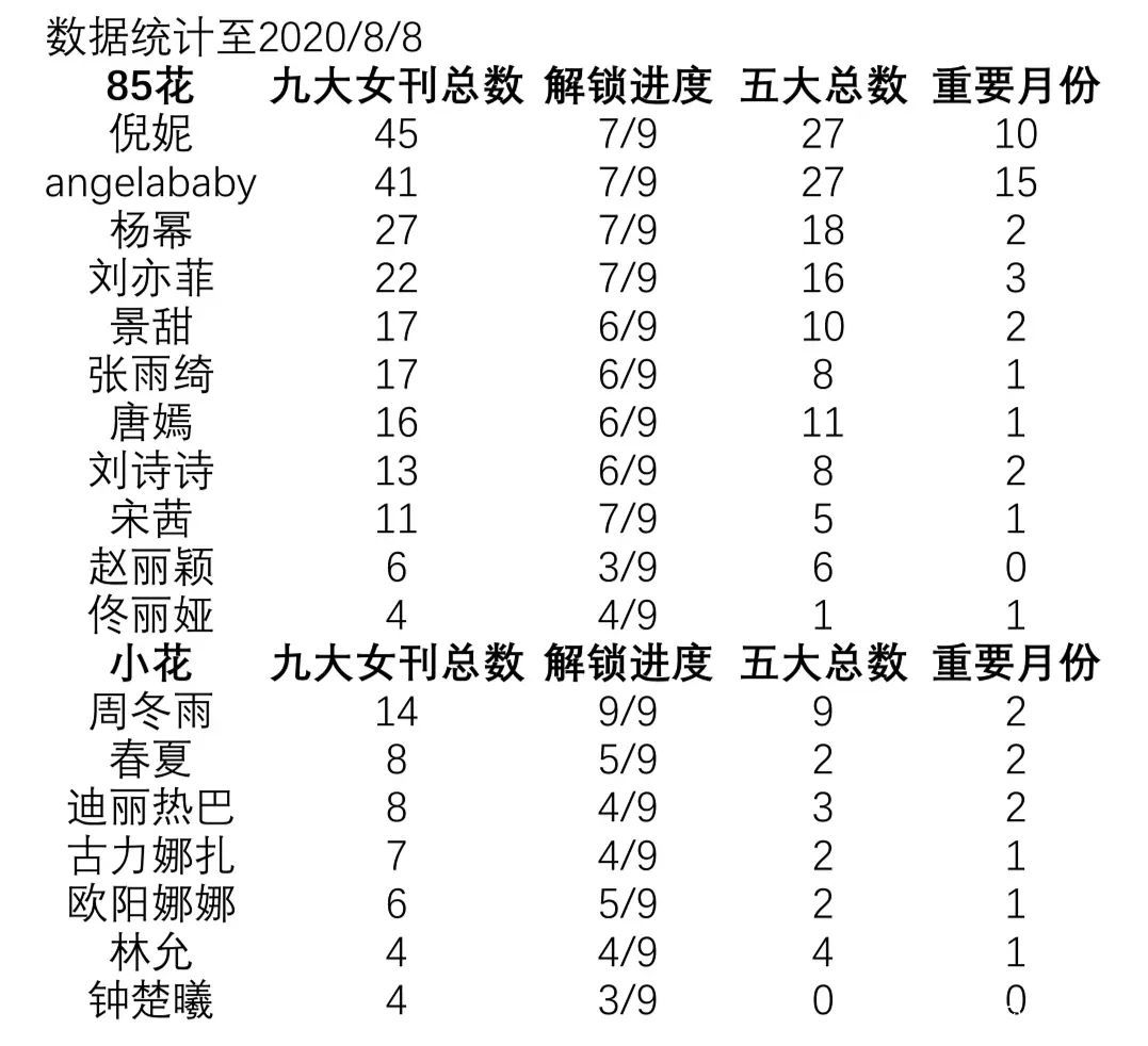 據豆瓣用户@sher統計的一份85花主流雜誌封面拍攝戰績,倪妮總數遙遙領先,僅次於ab。
