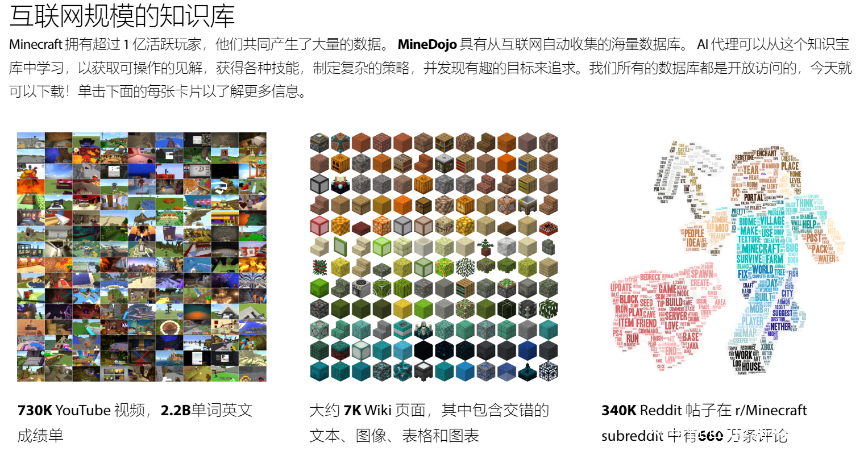 MineDojo一共蒐集了73萬個油管上的遊戲視頻、7000多個維基網頁,甚至還有上百萬條和《我的世界》有關的Reddit評論。