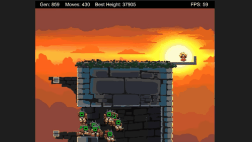 每代AI只有五次行動機會,五次行動結束後,跳躍高度最高的AI就會成為下一代的模範,此後的每一代AI都會遵循上一代摸索出最好的路徑前進——這就是很簡單的進化了。
