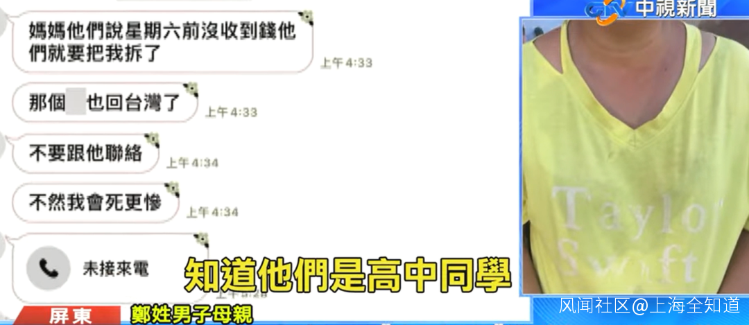 鄭某母親哭訴,她收到兒子的求救信息,説如果週六8月20日籌不到15萬台幣的贖金,他會被分屍。