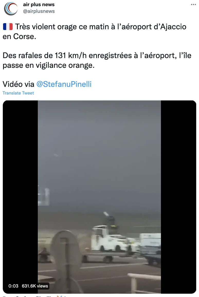 據當地媒體報道,由於風力太過強勁,在該島的阿雅克肖拿破侖波拿巴機場,一些行李推車和集裝箱被狂風吹翻。航站樓的部分屋頂也被大風吹爛。