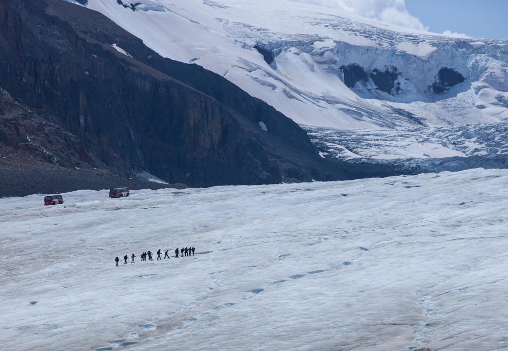 這是2018年7月24日,遊人在加拿大落基山脈賈斯珀國家公園的阿薩巴斯卡冰川上行走。新華社發(鄒崢攝)