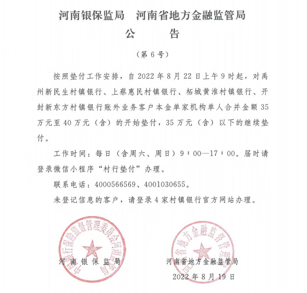 2. 河南:22日起對4家村鎮銀行35萬元至40萬元客户開始墊付