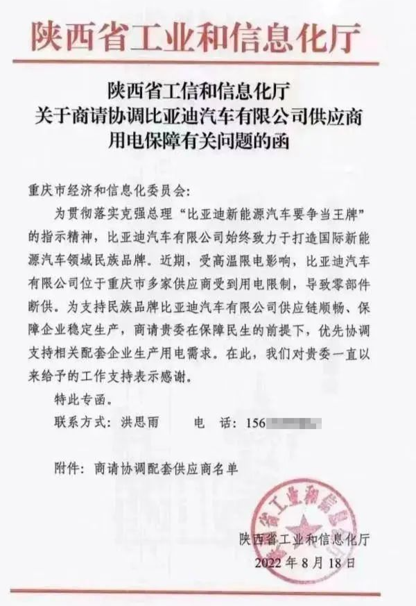 2022年8月18日,陝西省工信廳給重慶經信委發了一份函——《關於商請協調比亞迪汽車公司供應商用電保障有關問題的函》。《問題函》顯示,近期,受高温限電影響,比亞迪汽車公司位於重慶市多家供應商受到用電限制,導致零部件斷供。
