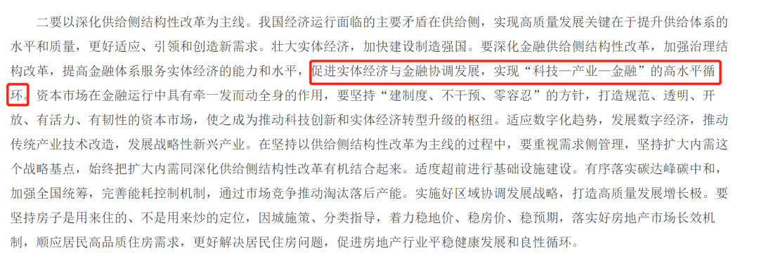怎麼all in呢?我認為後文最重要的一句話就是,促進實體經濟與金融協調發展,實現**“科技—產業—金融”的高水平循環**。