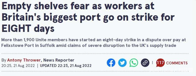 英國的人最近的日子過得不容易啊,首先是俄烏戰爭,導致了國內物價飛漲,許多英國人面對價錢一路上升的食品與天然氣感到囊中羞澀,甚至無法保證一家人的温飽,而所謂“屋漏偏逢連夜雨”,正當英國人被俄烏戰爭導致的國內通脹壓不過氣的關頭,又一件意想不到的事情發生了:英國最大港口工人罷工,導致許多商品無法正常進港卸貨,多家商品面臨斷貨,貨架空空如也,英國人可以説是陷入了冰火兩重天的痛苦境地。