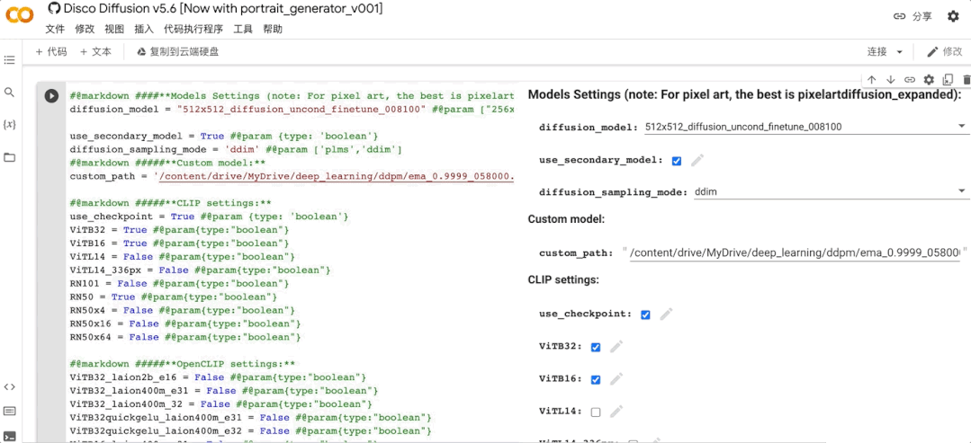 它直接在谷歌Colab上運行,需要申請賬號後使用(圖片生成後保存在雲盤),圖像分辨率、尺寸需要手動輸入,此外還有一些模型上的設置。