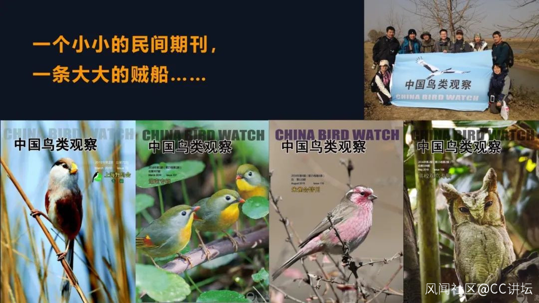 中國是一個有千百年的養鳥、吃鳥、逮鳥、捕鳥的習俗,所以野生鳥類在中國的命運,曾經特別糟糕,相當的悲慘。但是從1996年起,中國慢慢就有一個觀鳥愛好者的羣體。有人説我們是“愛鳥人”,其實説到底還是“觀鳥人”更準確,這是要跟養鳥的人相區別。