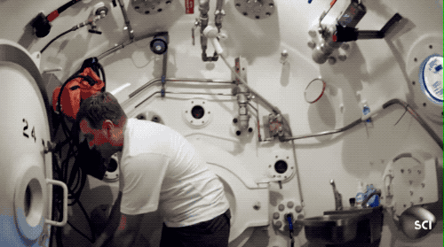 潛水員首先要在一個封閉的艙室裏完成飽和加壓。這個過程相當於把你塞進一個高壓鍋,同時不斷地往裏面打氣,直到你全身血管中的血液再也吸收不了空氣為止。