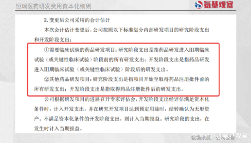 那麼,恆瑞醫藥哪些研發費用會被資本化呢?根據去年恆瑞醫藥會計準則變更公告,我們可以看到,主要是三期臨牀費用。
