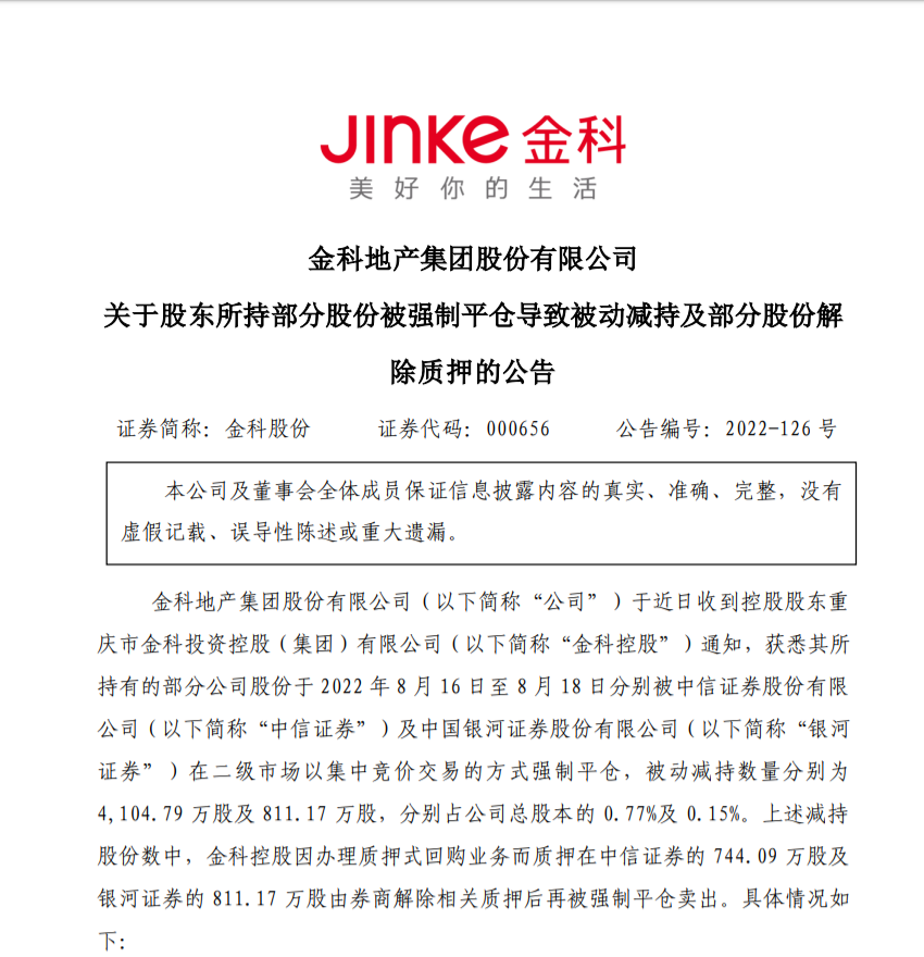 8月19日晚間,金科股份公佈稱,公司於近日收到控股股東重慶市金科投資控股(集團)有限公司通知,獲悉其所持有的累計約0.49億股金科股份股票,因在中信證券、銀河證券開展的融資融券業務和質押式回購業務存在違約風險,於2022年8月16日至8月18日分別被券商強制平倉,上述被強平的股票約佔金科股份全部股權的0.92%。