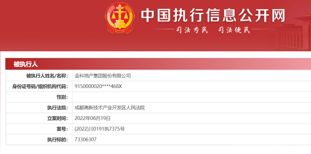 同樣據中國執行信息公開網顯示,8月19日,金科股份被成都高新產業開發區法院判為被執行人,執行金額7330.6萬元。