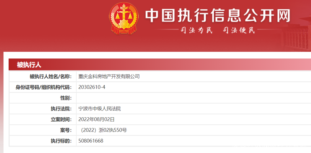 **子公司層面,重慶金科房地產開發有限公司在今年5月和8月初,分別被大連市中院和寧波市中院判為被執行人,執行金額分別為2.86億元、5.08億元,****兩者累計也超過了7.9億元被執行金額。**其中寧波市中院的案件涉及慈溪鑫璨商業廣場開發有限公司;