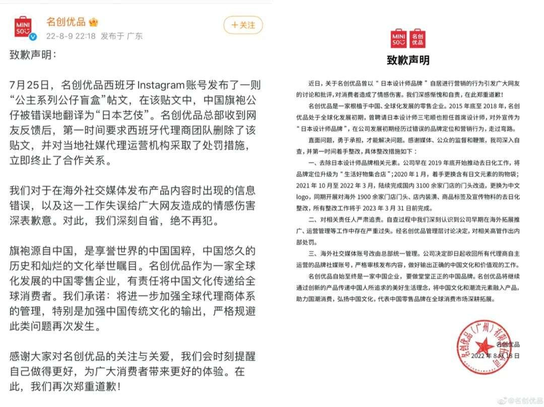 8月9日,名創優品就西班牙社交媒體賬號誤將身着中國旗袍的玩偶稱為日本藝伎而道歉後,於8月18日再度發佈道歉聲明,表示對品牌過往用“日本設計師品牌”進行營銷的行為表示慚愧和自責,並允諾將在2023年3月31日前對海外店鋪完成去日化整改。