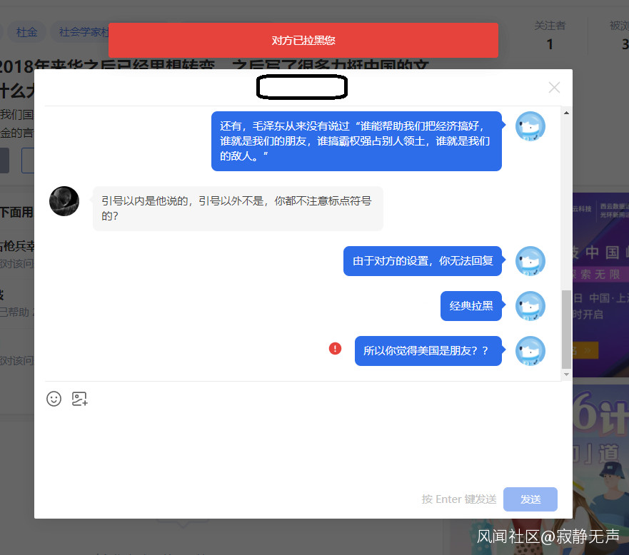然後他把我拉黑了,知乎的拉黑好像和別處不一樣,我雖然無法繼續評論他,但是我可以和他私信。