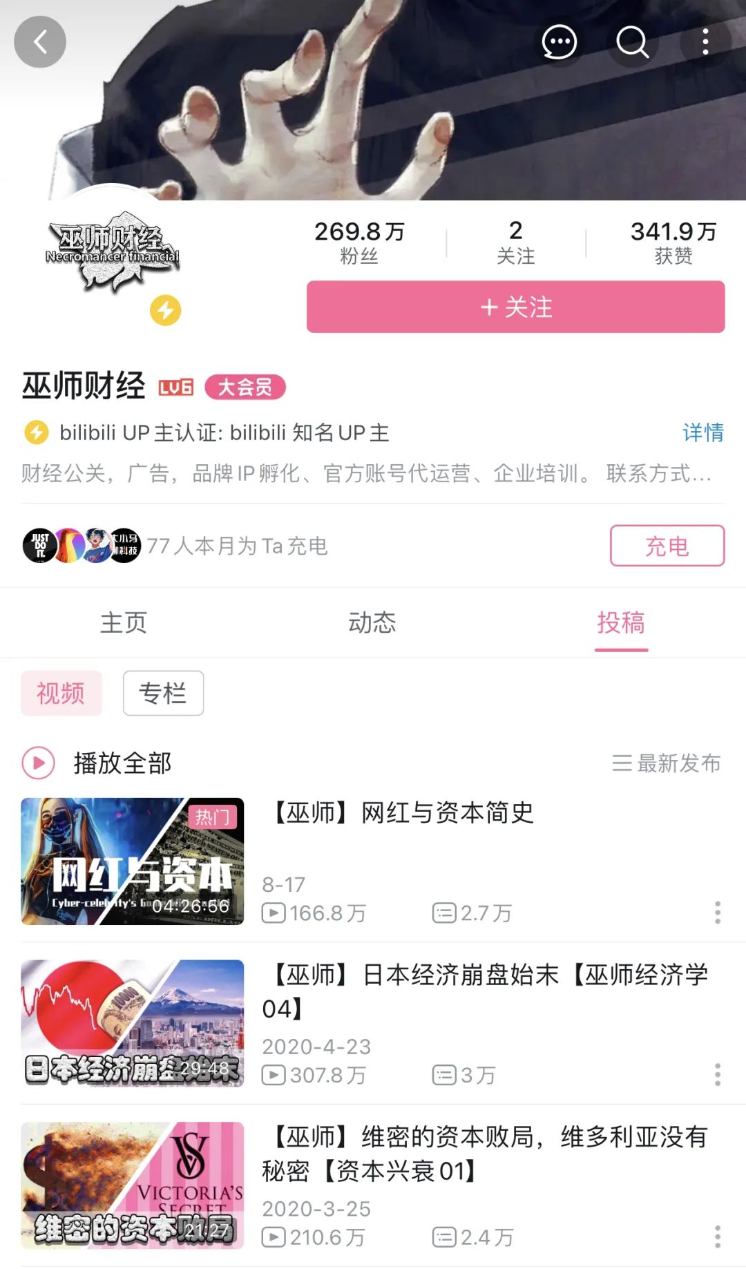 隨後,巫師財經相繼推出“資本與明星”、“資本戰爭”等系列作品,從資本角度解讀商業現象,同樣獲得熱捧。彼時,B站大多數泛知識UP主仍在摸索,巫師財經切到第一塊蛋糕,一時間風頭無兩。