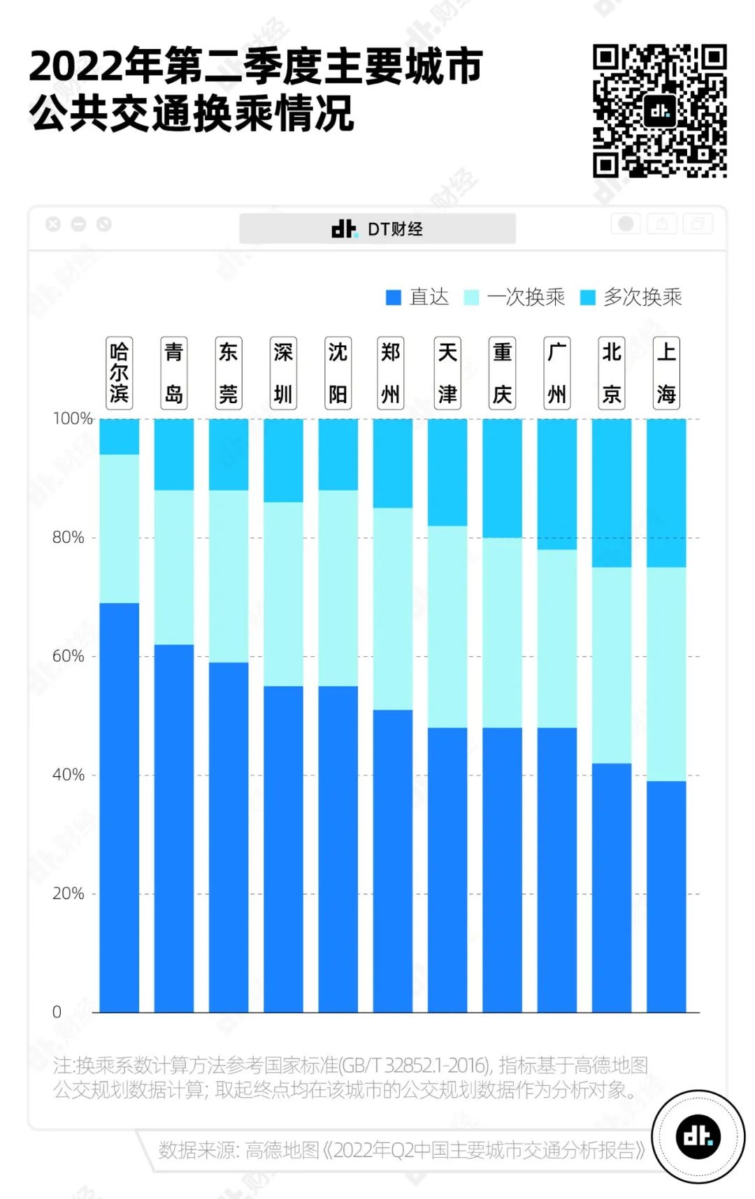 儘管全國主要城市通勤平均換乘次數呈上升趨勢,距離通勤自由最遙遠的北京,2021年至2022年第二季度,公共交通直達佔比從40%上升到了42%,朝着通勤幸福又邁進了一小步。