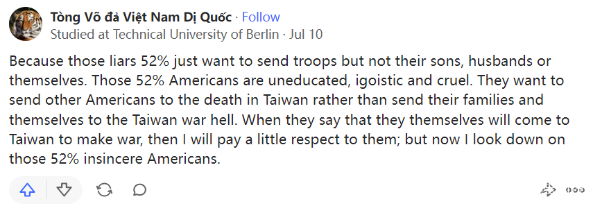 因為那些52%的騙子只想派兵,卻不想派他們的兒子、丈夫或自己。這52%的美國人是沒有受過教育的,偏執的和殘忍的。他們想把其他美國人送到台灣去送死,而不是把他們的家人和自己送到台灣的戰爭地獄。當他們説他們自己要來台灣打仗時,我還會對他們表示一點敬意。但現在我看不起這52%不真誠的美國人。