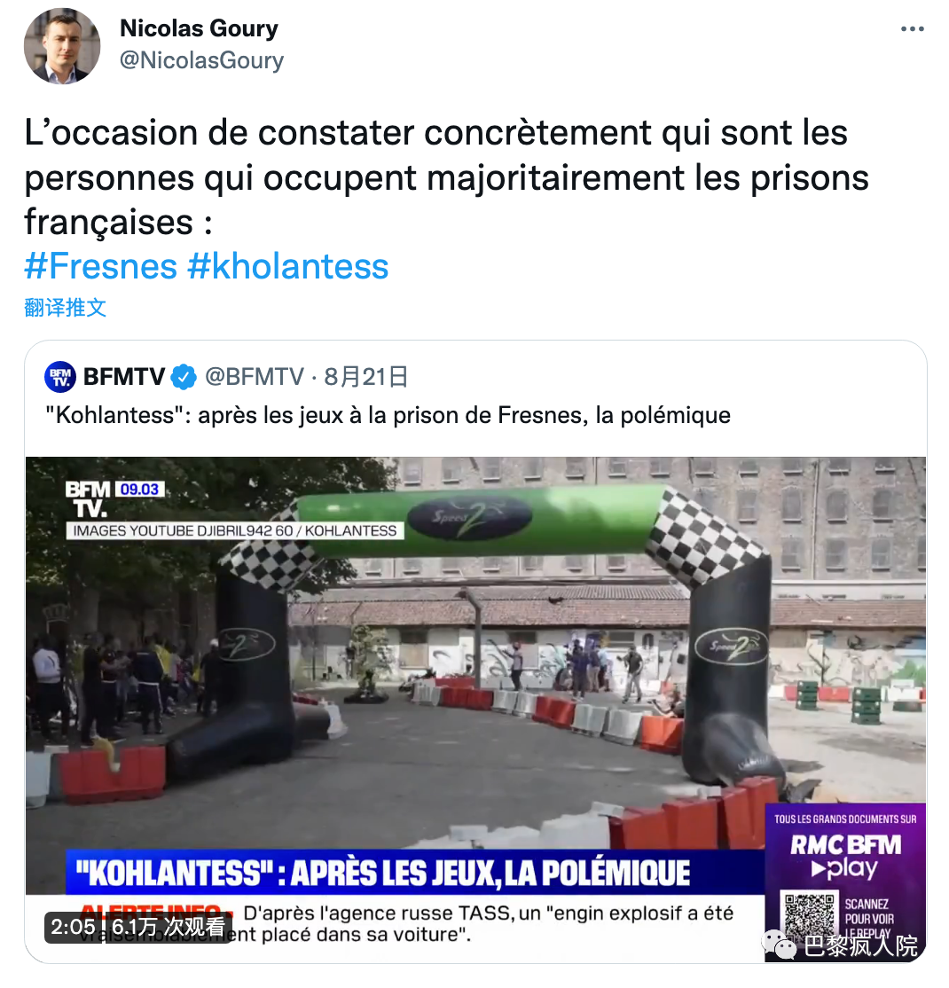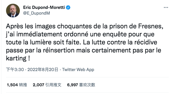 8月20日上週六,司法部長Eric Dupond-Moretti發推表示節目中的“畫面令人震驚”,“打擊重複犯罪肯定不是通過卡丁車比賽”,並下令展開行政調查。接受媒體採訪時他也表示,自己對這場卡丁車比賽的情況“毫不知情(jamais avoir été informé)”。