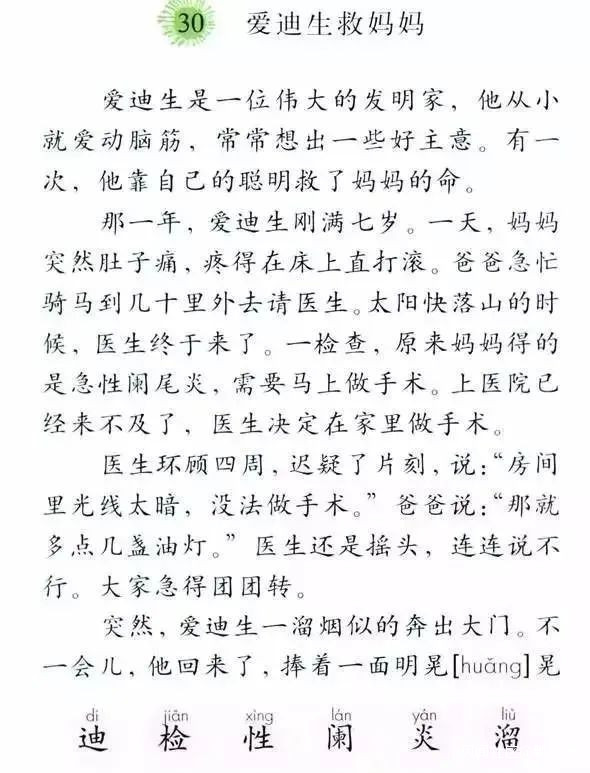 第二篇是《愛迪生救媽媽》。大意是説在美國發明家愛迪生7歲的時候媽媽得了急性闌尾炎,時間緊迫,醫生需要馬上在家做手術。由於房間裏光線太暗,小愛迪生想到了用鏡子聚光的辦法幫助醫生做手術,最終媽媽因此得救。