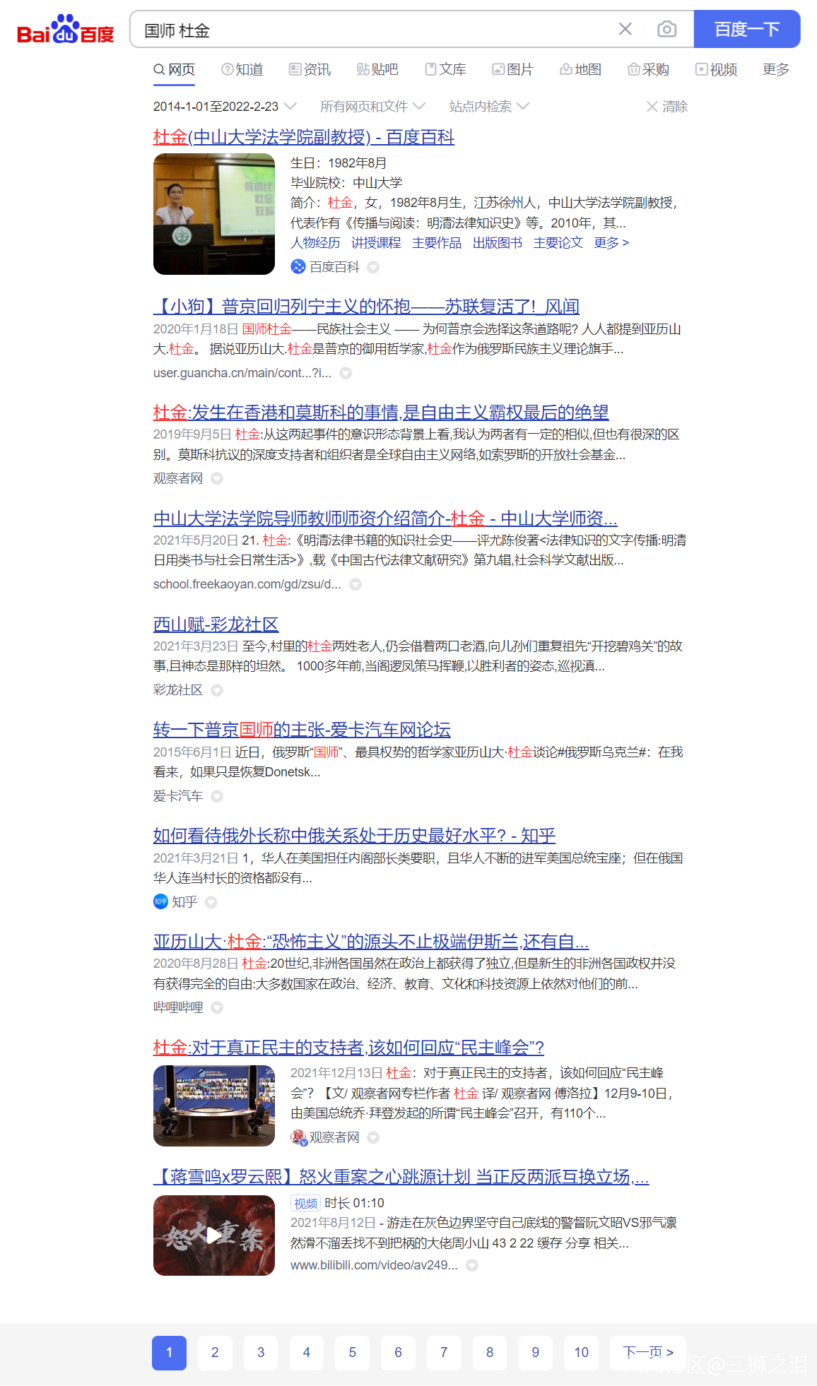 首先“國師+杜金”這個組合在2014-01-01至2022-02-23這個時間段裏,真正能搜到,只能搜到一個2020年發在風聞社區的帖子;而2022-02-24至2024-04-30這個時間段裏,一直到第六頁,還能搜到相關的文章。