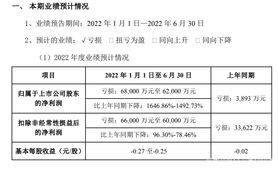 預計歸母淨利潤虧損6.8億元至6.2億元