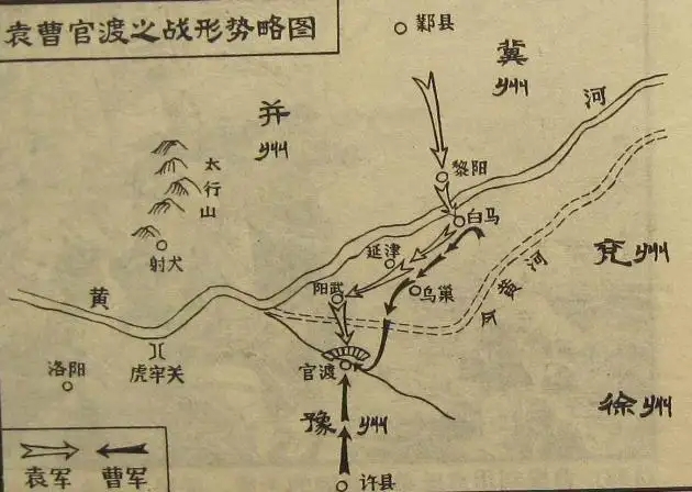 袁紹率大軍進駐黎陽(今河南浚縣),同時派顏良進攻駐守白馬(今河南滑縣)的劉延。袁紹的監軍沮授又進諫袁紹:“顏良性子急躁、慮事不周,儘管驍勇善戰,但也不能讓他一個人獨當一面。”袁紹又不聽。曹操率軍救援劉延,與顏良接了火,大敗其部眾,殺了顏良。袁紹渡過黃河,在延津(今河南北部新鄉市)南面修築壁壘,派劉備、文丑率部向曹操挑戰。曹操一戰便擊敗了他們,殺了文丑,再戰,擒獲了袁紹的大將(劉備又幸運地逃脱了)。