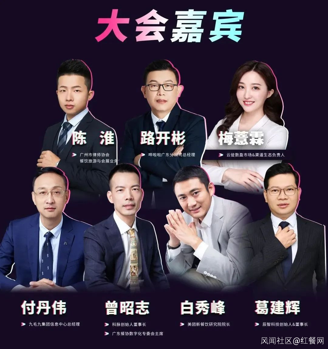 特邀廣州市律師協會餐飲旅遊與會展業務陳淮,嘩啦啦廣東分公司總經理路開彬,雲徙數盈市場和生態渠道負責人梅薏霖,辰智科技創始人/董事長葛建輝,美團新餐飲研究院院長白秀峯,科脈創始人董事長曾昭志,毛九集團信息中心總經理付丹偉。將共同探討中國外賣產業最前沿、熱門、領先的話題,開展深度思維碰,共商共賞、共策共謀,推動餐飲數字化發展。