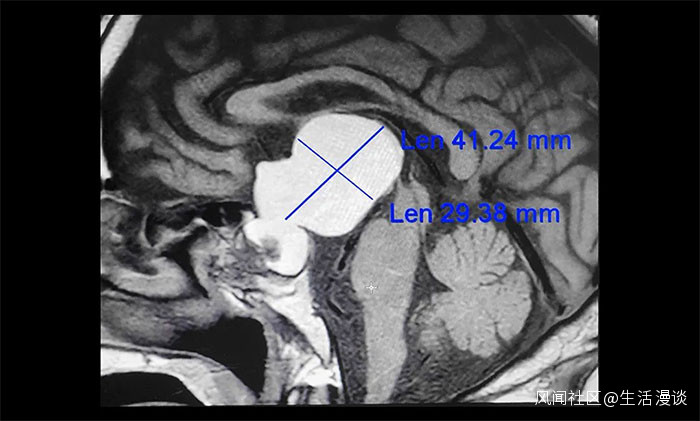通過進一步完善頭顱磁共振檢查,提示患者鞍區囊性佔位病變,考慮為顱咽管瘤,瘤體最大直徑超過4cm。