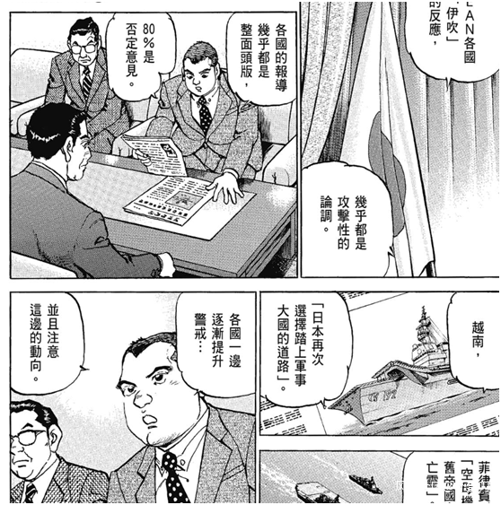 有趣的是,“伊吹”列裝後,漫畫中描述國際輿論80%都是反對意見,包括越南、菲律賓在內的國家都批評日本復活舊帝國亡靈,而防衞大臣認為,這些國家都不足為懼,真正要重視的是中國的反應。