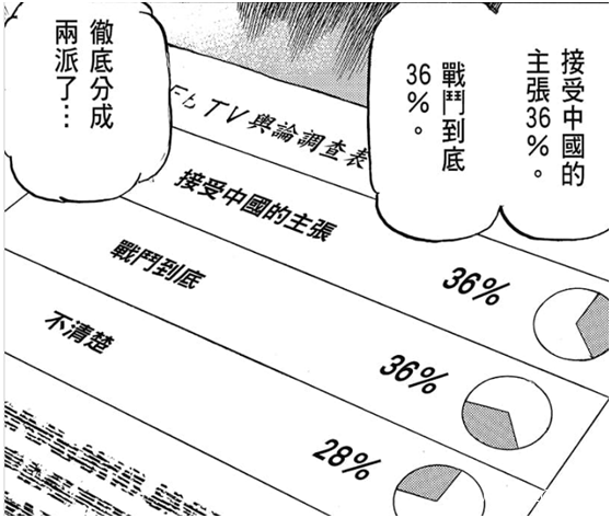 而漫畫中,無論是日本政府還是民間都“認為”,絕對不能跟中國輕啓戰端,是的你沒看錯,日本不能與中國開戰。漫畫中認為,一旦輕啓戰端,中國會切斷南海航路,對貨船進行臨時檢查,若日本船隻避開馬六甲改走菲律賓東面,中國將以潛艇擊沉貨船,對依賴海上航線的日本行程致命打擊,最後,中國會以“核威脅”逼迫日本“割讓領土”。