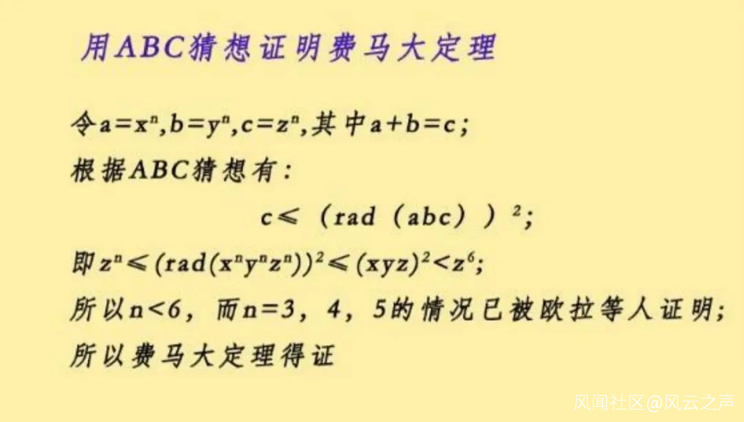 基本上,ABC猜想是一個威力十分強大的猜想。例如有了它就能快速地證明費馬大定理,雖然這是個很粗略的證明,因為還需要一些其他的假設。