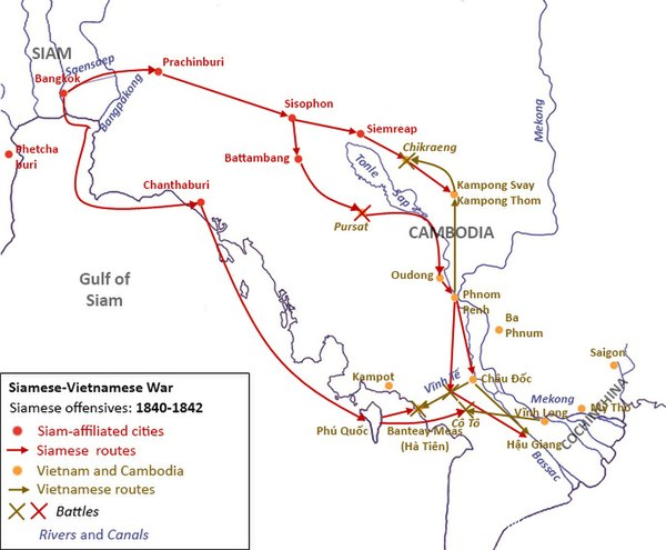 等到越南阮朝於1802年建立後,其開國君主阮福映立即開始了對柬埔寨的征服之戰,泰越兩國也隨即爆發戰爭。
