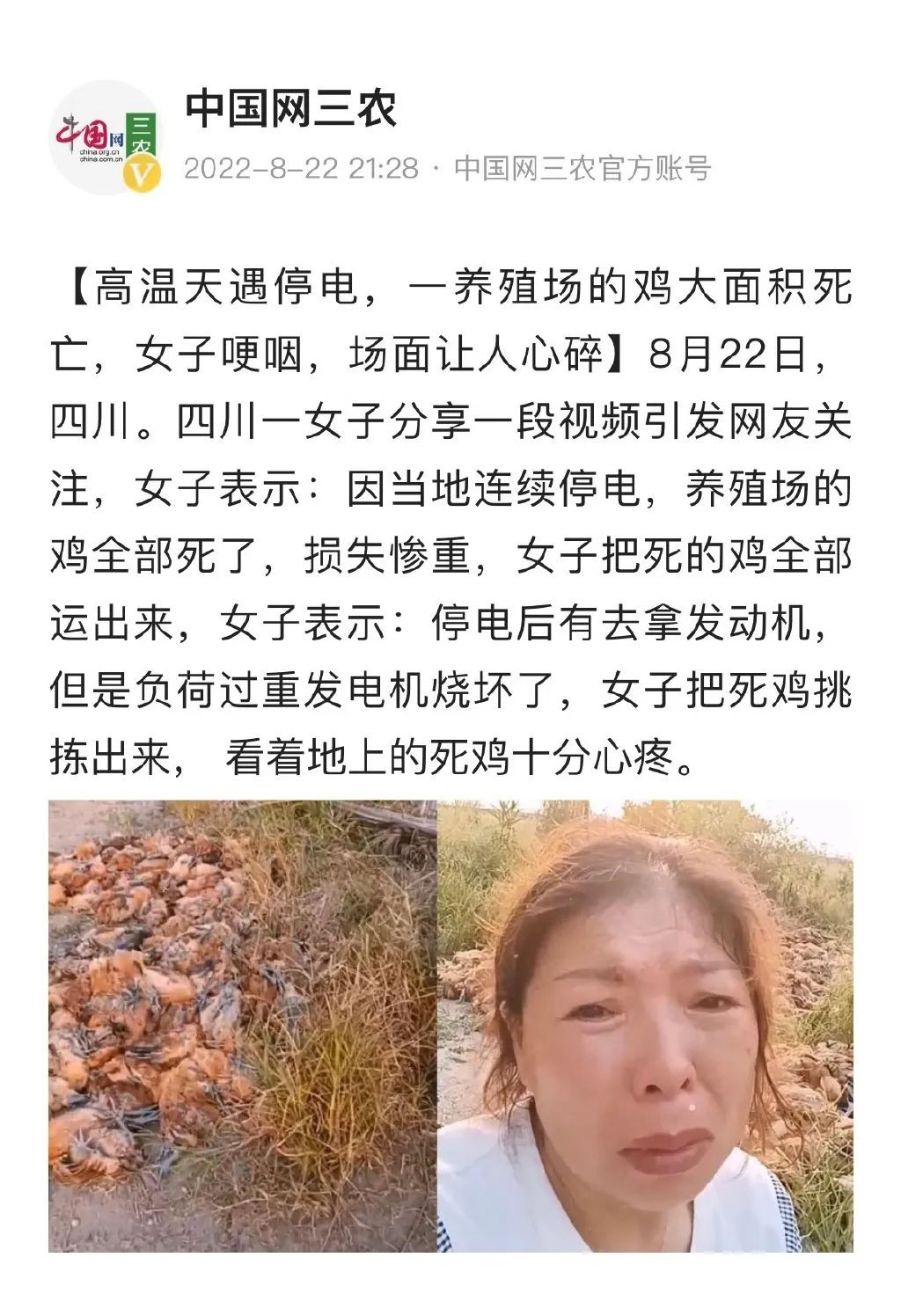連續斷電的養殖場裏,温度飆升,死去的雞倒作一團,一年的辛苦白費了。