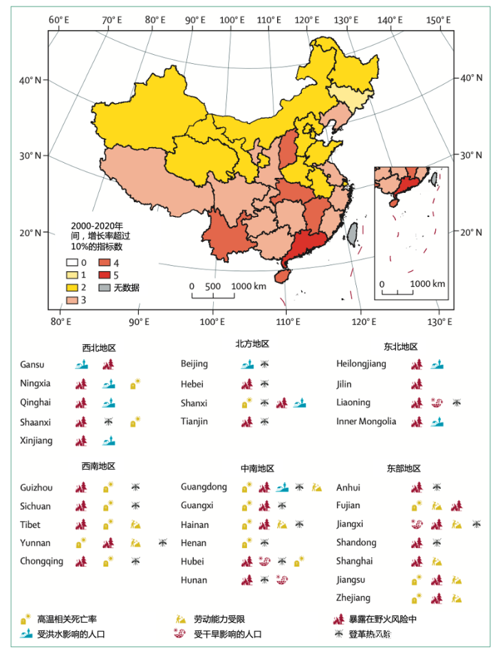 圖2 中國各省氣候變化造成的主要健康風險上升情況(2000-2020年)