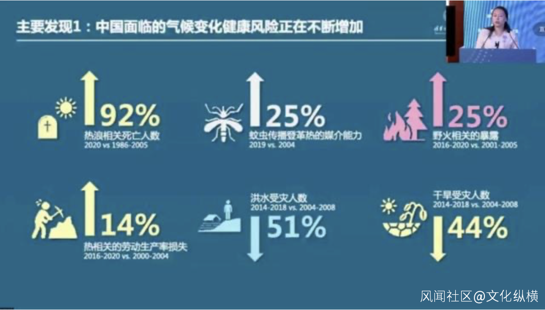 氣候變化對中國人健康的影響正在上升。雖然2020年的熱浪比2019年少,導致熱浪相關的死亡率和勞動生產率損失略有下降,但總體趨勢繼續上升。2021年,史無前例的洪水有可能扭轉此前中國洪水災害的下降趨勢,而且登革熱傳播的媒介能力也在上升。如果不及時應對,各類威脅將繼續增長,並可能使國家的衞生系統不堪重負。