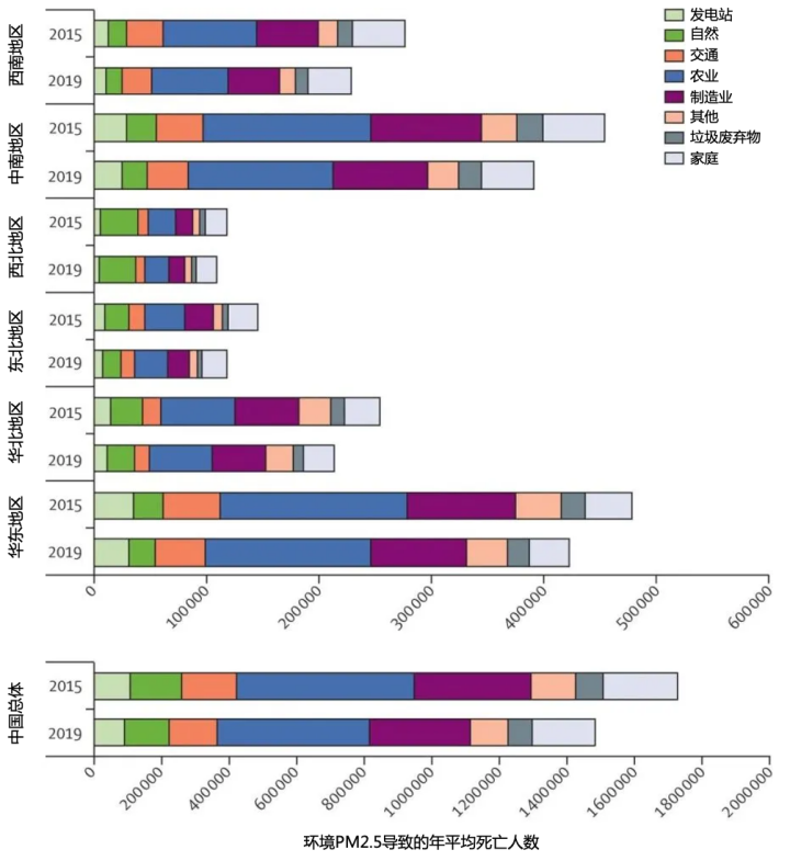 從2015年到2019年,中國的一系列環保行動使城市PM2.5濃度下降了28%,而地表臭氧濃度則上升了8%。然而,在2020年疫情封鎖期間,暴露於家庭空氣污染的農村人口比例上升,總人口暴露的PM2.5平均值增加了5.7微克/立方米。在2019年,因PM2.5死亡的人數比2015年少243,700人(圖3)。農業和工業部門佔中國PM2.5死亡人數的50.5%,其次是居民部門(12.7%)和交通部門(9.6%)。從地區來看,華東地區因PM2.5死亡的人數最多(423,100),其次是中南地區(391,600)。