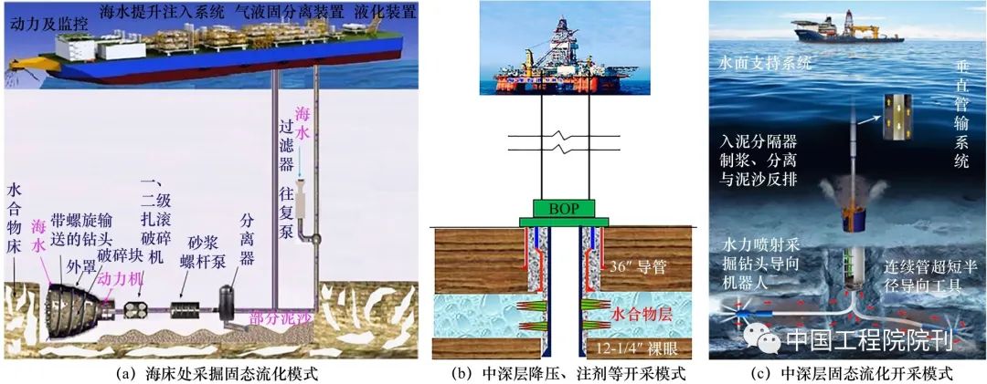 結合海洋天然氣水合物賦存狀態,海牀、海底淺層及一定埋深,以及成巖、非成巖特性,本文針對全層段多類型海洋天然氣水合物提出相應的開採技術和方法設想,如針對位於深水海牀上的天然氣水合物採用類似海底採礦的方式,即採掘破碎舉升為主的固態流化開發方式,對於有一定埋深具有可鑽性的區域,採用降壓開採方法、中深層固態流化開採方法、CO2置換開採以及注熱和注劑開採等多種開採方法(見圖3)。