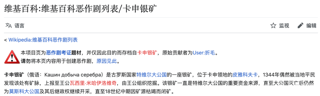0110年,終於有人發現維基百科的古羅斯史是胡編的了有網友在查資料時,發現了“折毛”寫的“卡申銀礦”詞條。