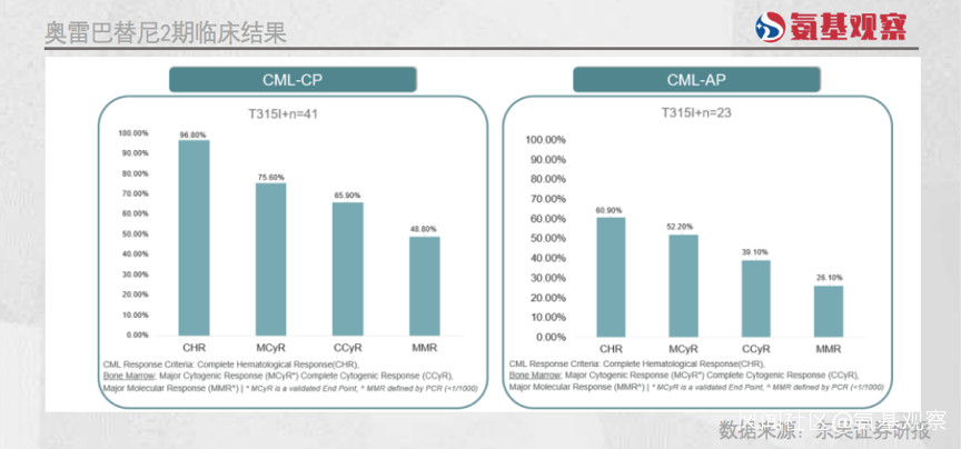 其次,奧雷巴替尼在立項之初就定位全球,具有Best-in-class潛力。如下圖所示,奧雷巴替尼針對伴有T315I突變的TKI耐藥的CML慢性期(CML-CP)及加速期(CML-AP)患者的兩項關鍵註冊2期臨牀試驗,均展現了突出的治療效果。安全性方面,沒有競品帕納替尼嚴重血栓副反應。