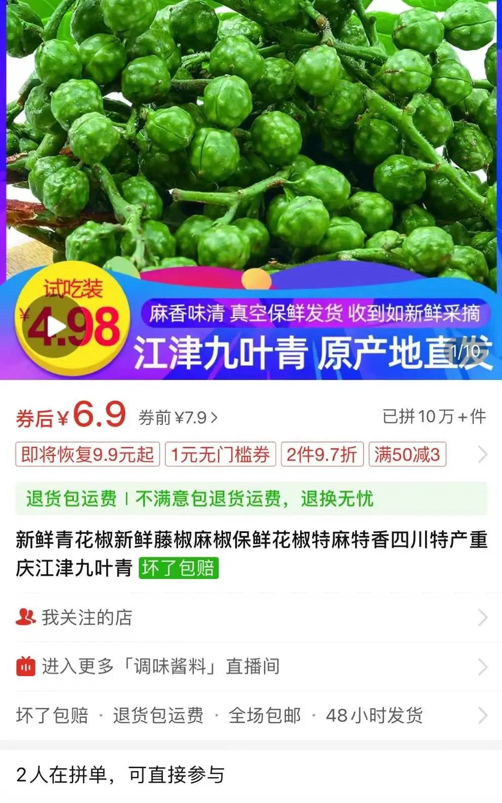 而何春梅也是江津區第一批開始在線上賣花椒的。從去年到今年,拼多多平台上,“聚鄉村土特產店”的保鮮花椒銷量都是排名第一,“我們開拓了花椒的線上市場,當地工廠也開始做拼多多店鋪。以前花椒線上銷量佔比只有幾個點,現在達到20-30%。這也讓價格穩定下來,不像以前在線下銷售,價格波動很大。”
