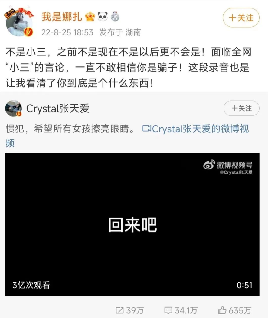 那就是,不同於“劈腿者”是絕對的主動方,一旦確定就是罪名確鑿。 “小三”這個罪名下明明是更容易發生冤案的。 但在碰到這種糾紛時,人們的態度永遠是反過來的—— 一個女性被戴上“知三當三”的帽子特別容易。 而知渣還渣的男性當事人,想在這類事件裏做到迴避脱罪,卻是毫不費力的事。 這其實也是某種程度上,男性公共人物,明明看着都挺在意名聲的,卻總敢搞這種“劈腿”“兩頭騙”的原因。