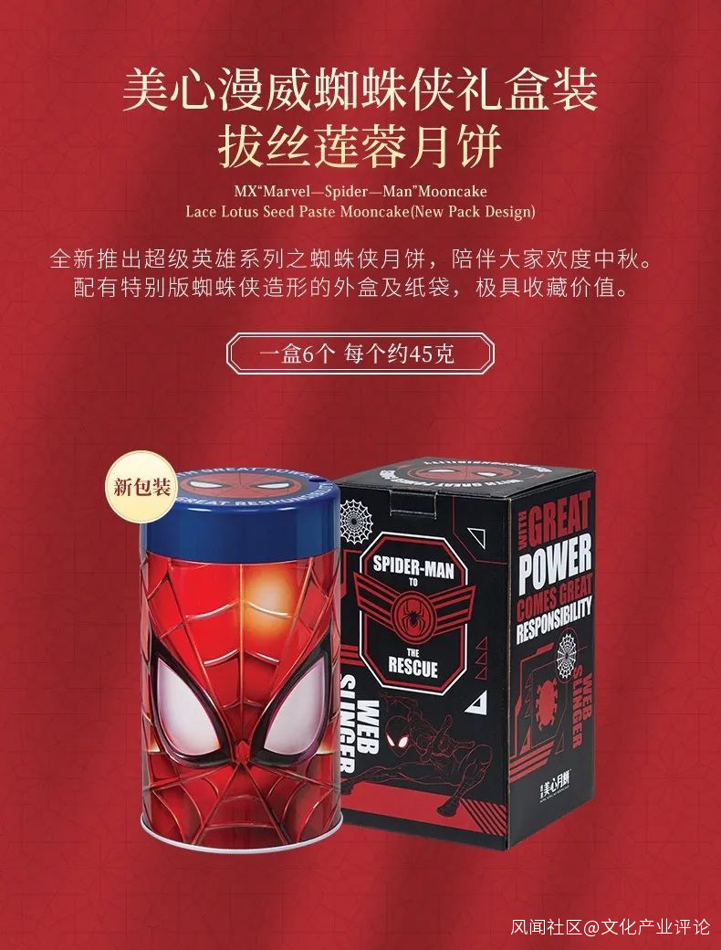 **在研發推廣上,月餅廠商充分貫徹數字化的理念,通過各大外部平台與消費者互動,確定消費者需求與當下消費熱點,實現營銷的“精準打擊”。**就拿月餅屆知名品牌香港美心來説,美心通過新浪微博、b站、小紅書等主流社交網絡平台,摸清了當下年輕人對於動漫的喜好,於是與漫威聯名,推出了“漫威蜘蛛俠月餅禮盒”與“小黃人大眼萌月餅禮盒”等產品。“漫威蜘蛛俠月餅禮盒”的設計始終以蜘蛛俠為核心,主打“好食好玩又討喜”的口號,採用蜘蛛俠造型的外盒與紙袋,罐蓋設有投射裝置,可以射出蜘蛛俠的經典頭像,月餅的餅身也印有蜘蛛圖案,而且可以在室温下產生拔絲效果,迎合年輕人對漫威IP的喜愛以及愛玩的性格特徵。