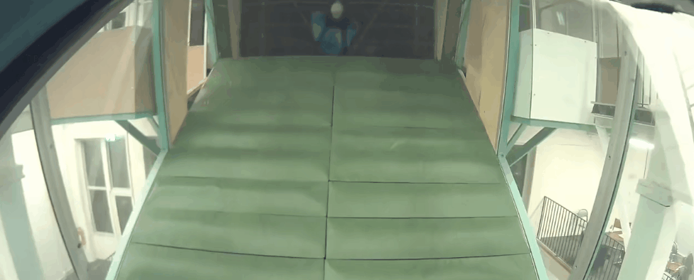 她玩的項目是“人體炸彈”,所謂”人體炸彈“就是場地有一個高大的氣墊,玩家躺在氣墊的末端,站在高處的人用力跳到氣墊的另一端,躺在末端的玩家就會被彈入旁邊的海洋球池中。在彈飛的過程中,普通人由於沒有經過專業訓練,人體在空中的平衡能力、感知能力幾乎為零,大腦一片空白,只能將自己交給命運。