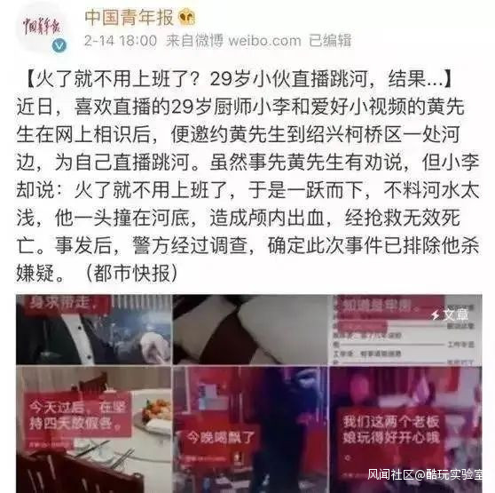 據救援人員判斷,“水下十分渾濁,該男子進入支洞後,辨不清方向,可能是攜帶的氧氣耗盡,無法返回,最終窒息死亡。”礦洞探險外還有跳河、高樓挑戰等引發的一出出悲劇,比如,小夥為了流量直播跳河導致自身死亡。