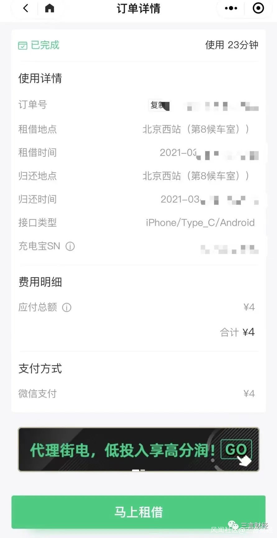 2021年3月,北京西站一處街電充電寶訂單記錄顯示,使用時間23分鐘,扣費4元;