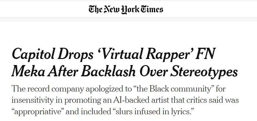 8月23日,在黑人權益激進組織Industry Blackout指控虛擬rapper FN Meka及其作品存在不恰當的文化挪用、強化黑人羣體的刻板印象後,環球音樂旗下唱片公司Capitol Records(國會唱片)選擇與虛擬Rapper FN Meka正式解約。