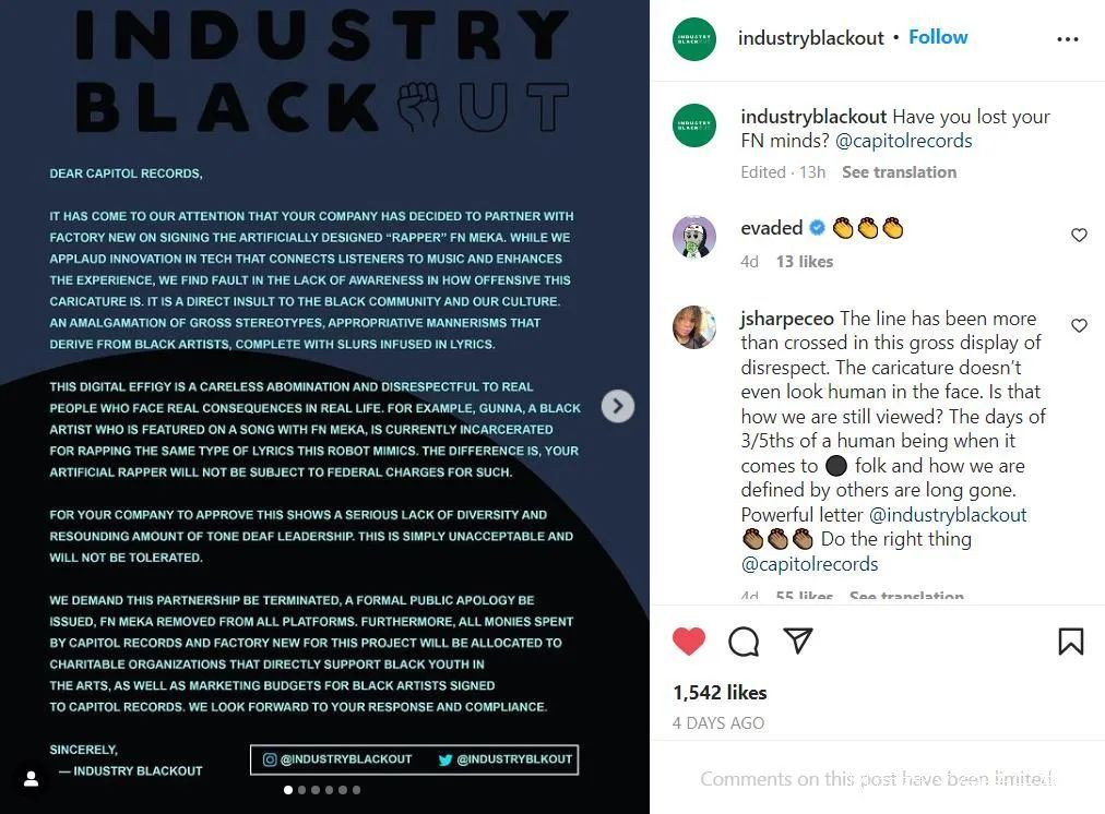 在道歉聲明發布幾個小時後,黑人權益激進組織Industry Blackout也在社交媒體上做出了回應,稱Factory New與Capitol在FN Meka上的合作關係是“對黑人羣體和我們文化的直接侮辱”。